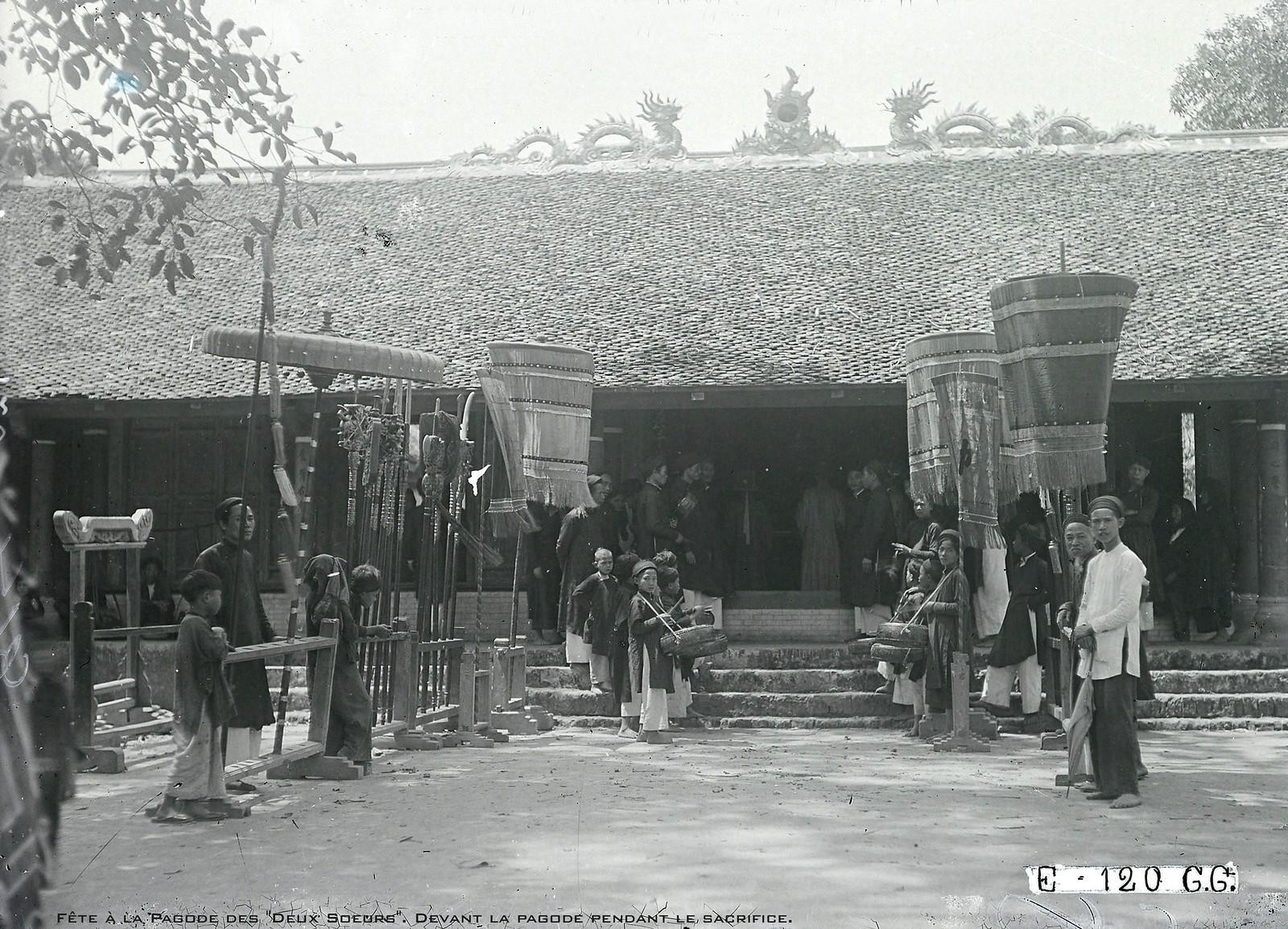 Lễ hội đền Hai Bà ở Hà Nội khoảng năm 1920-1929: Khung cảnh ở sân đền. Trong điện thờ, các vị chức sắc đang làm lễ trước bàn thờ. Ảnh: Phủ Toàn quyền Đông Dương