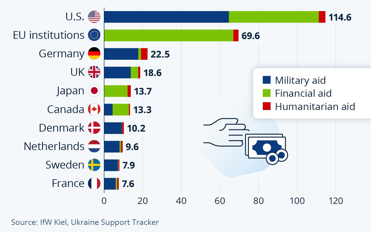 Trong giai đoạn 2022-2023, viện trợ của châu Âu đạt mức cao nhất với tổng cộng khoảng 110 -130 tỷ USD, bao gồm hỗ trợ tài chính, quân sự và nhân đạo. Trong khi đó, Hoa Kỳ hỗ trợ khoảng 100-113 tỷ USD, chủ yếu cho vũ khí và quân sự. Bước sang 2024-2025 với sự kiện tái đắc cử Tổng thống Hoa Kỳ của Donald Trump, Mỹ từng bước thu hẹp vai trò của mình trong cuộc xung đột, châu Âu từ đó buộc phải tăng cường đầu tư quân sự, mua sắm vũ khí từ Mỹ do kho dự trữ trở nên cạn kiệt trong khi chiến sự vẫn chưa có dấu hiệu kết thúc. Trong đó điển hình là các nước đứng đầu khối đứng lên kêu gọi tăng ngân sách chi tiêu quốc phòng theo áp lực “tự gánh vác nhiều hơn” từ Washington. Tuy vậy, viện trợ của châu Âu trong năm 2025 lại ở mức thấp nhất kể từ đầu chiến sự, do năng lực tài chính không đủ sức gánh vác và nội bộ bộc lộ những căng thẳng.