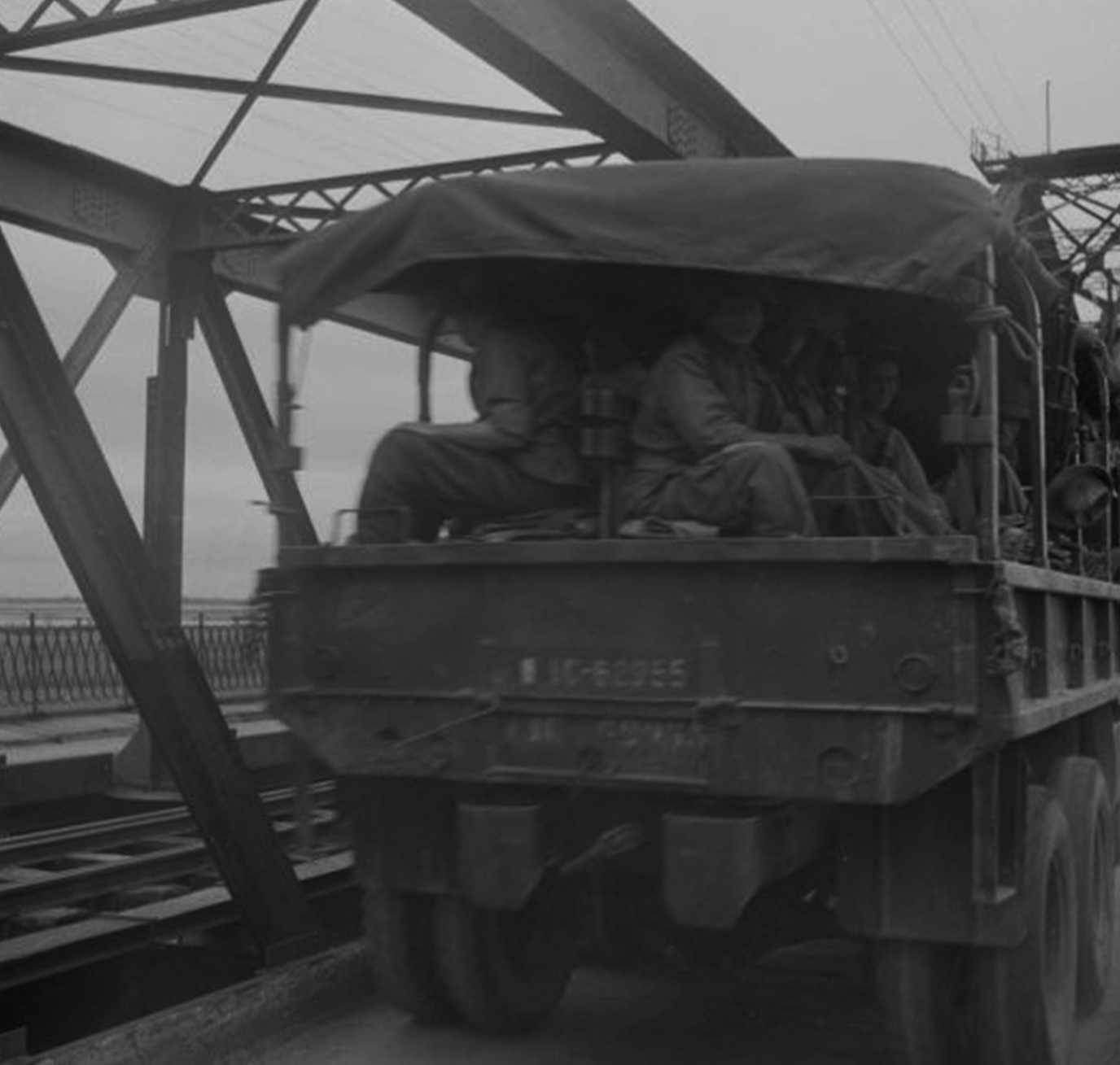 Xe tải chở lính biệt kích của Lực lượng viễn chinh Pháp ở Viễn Đông băng qua cầu Long Biên rời khỏi Hà Nội tháng 10/1954. Ảnh: Réne Adrian