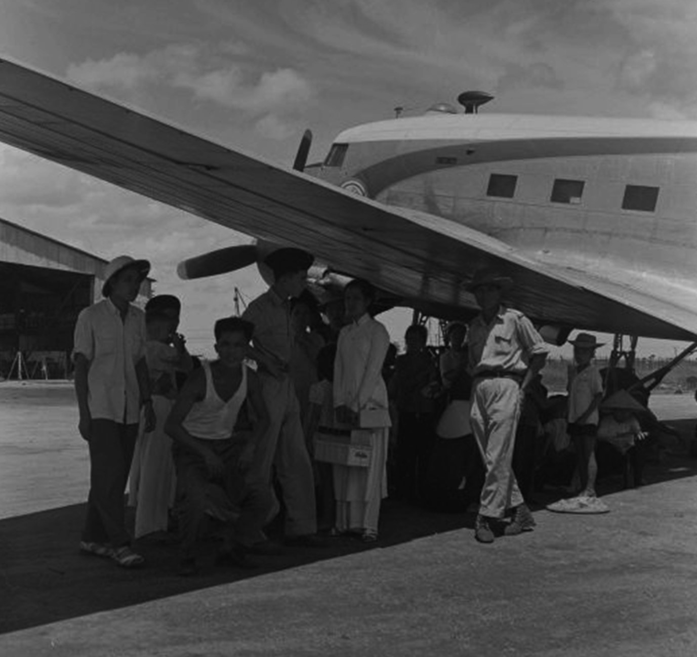 Một vài người dân và lính Pháp tránh nắng dưới cánh máy bay Dakota, cất cánh theo đường bay Hà Nội – Sài Gòn từ sân bay Gia Lâm tháng 8 năm 1954. Ảnh: Jean Lussan